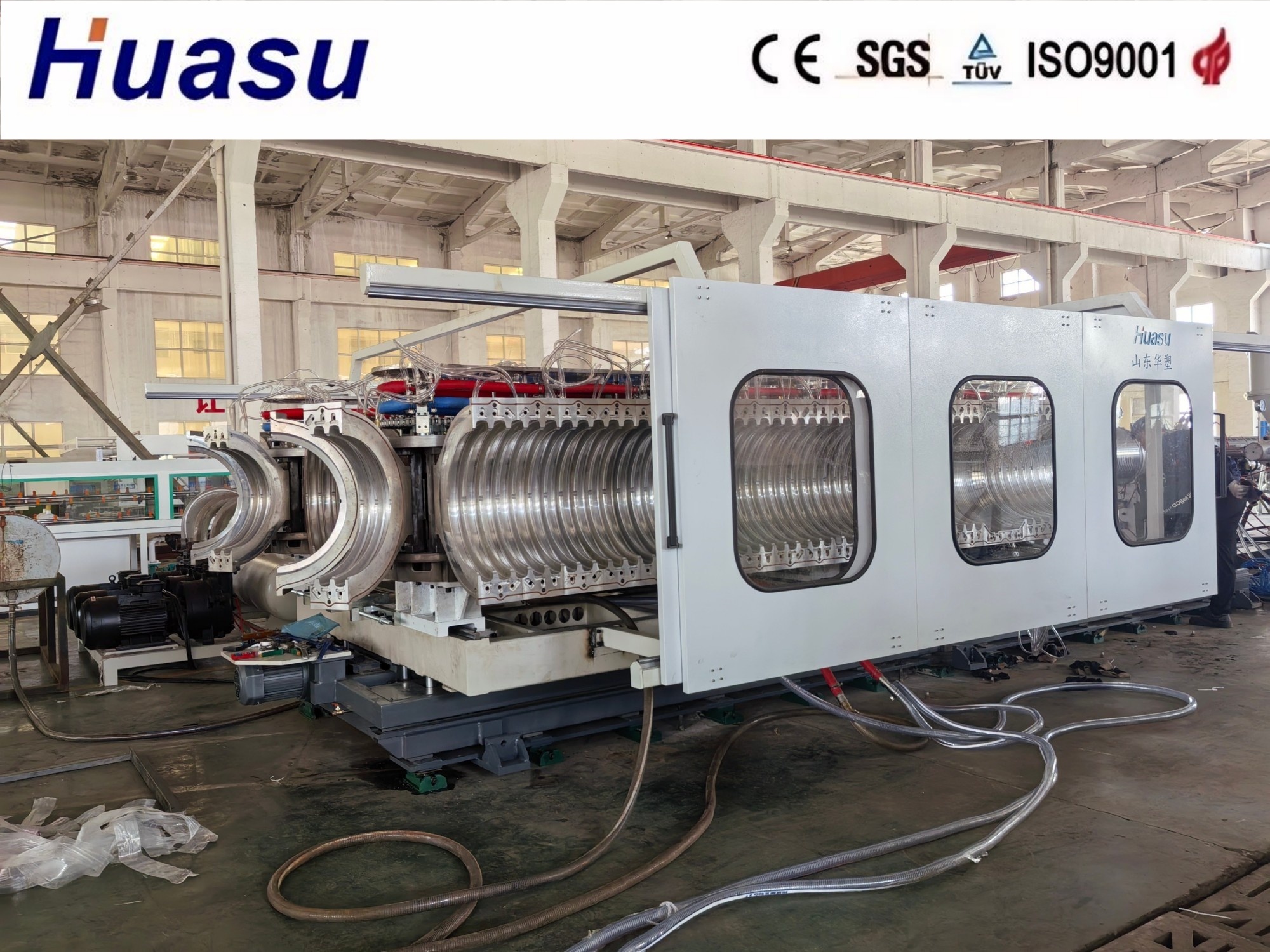 يمثل خط أنابيب الجدران المموجة المزدوجة الجيل الثالث من التكنولوجيا المطورة من Shandong HUASU. يتميز هذا الإصدار المتقدم بتحسينات كبيرة بما في ذلك زيادة بنسبة 20-40٪ في إنتاج الطارد وسرعة الإنتاج مقارنة بالطرازات السابقة. تمكن هذه التحسينات من عملية توسيع الحواف عبر الإنترنت الأكثر كفاءة، مما يضمن جودة وأداء فائقين لمنتجات الأنابيب المموجة.